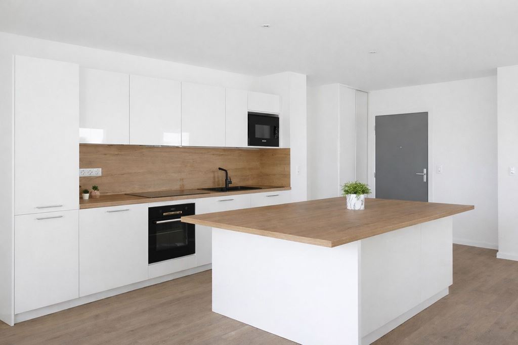 Il dispose d'une entrée avec placard desservant directement le grand espace de vie de 61m2, très lumineux grâce à ses nombreuses ouvertures sur la terrasse.