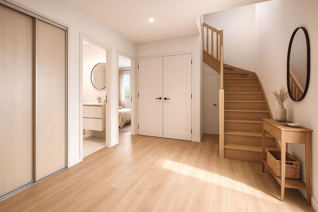 Dès l’entrée, un hall aménagé avec placard et espace de rangement sous l’escalier annonce le ton : fonctionnalité et raffinement.